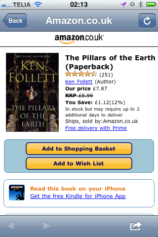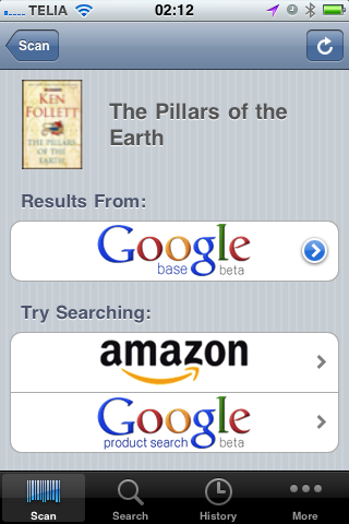 Coming back to work reading my flooded reader-feed finding a on-spot article, I started to use an app called Bakodo (bar code in Jap.), and it works ๐ Well it have obvious drawbacks given that it still is mainly focused on US, and do not hold a good back-end data raw material. I used my summer reading, Pillars of the Earth and got a quick response.